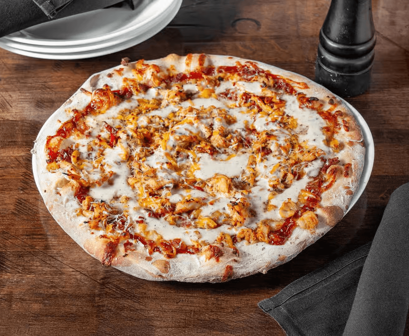 12" hand-stretched pizza with BBQ Sauce, Mozzarella, Bacon, Corn Salsa, Smoked Cheddar and BBQ Ranch Drizzle.
